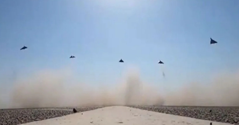 Máy bay không người lái cất cánh từ một địa điểm phóng trên sa mạc trong đoạn video do truyền thông nhà nước Iran công bố. Ảnh:  Truyền thông nhà nước Iran/thestatesman.com